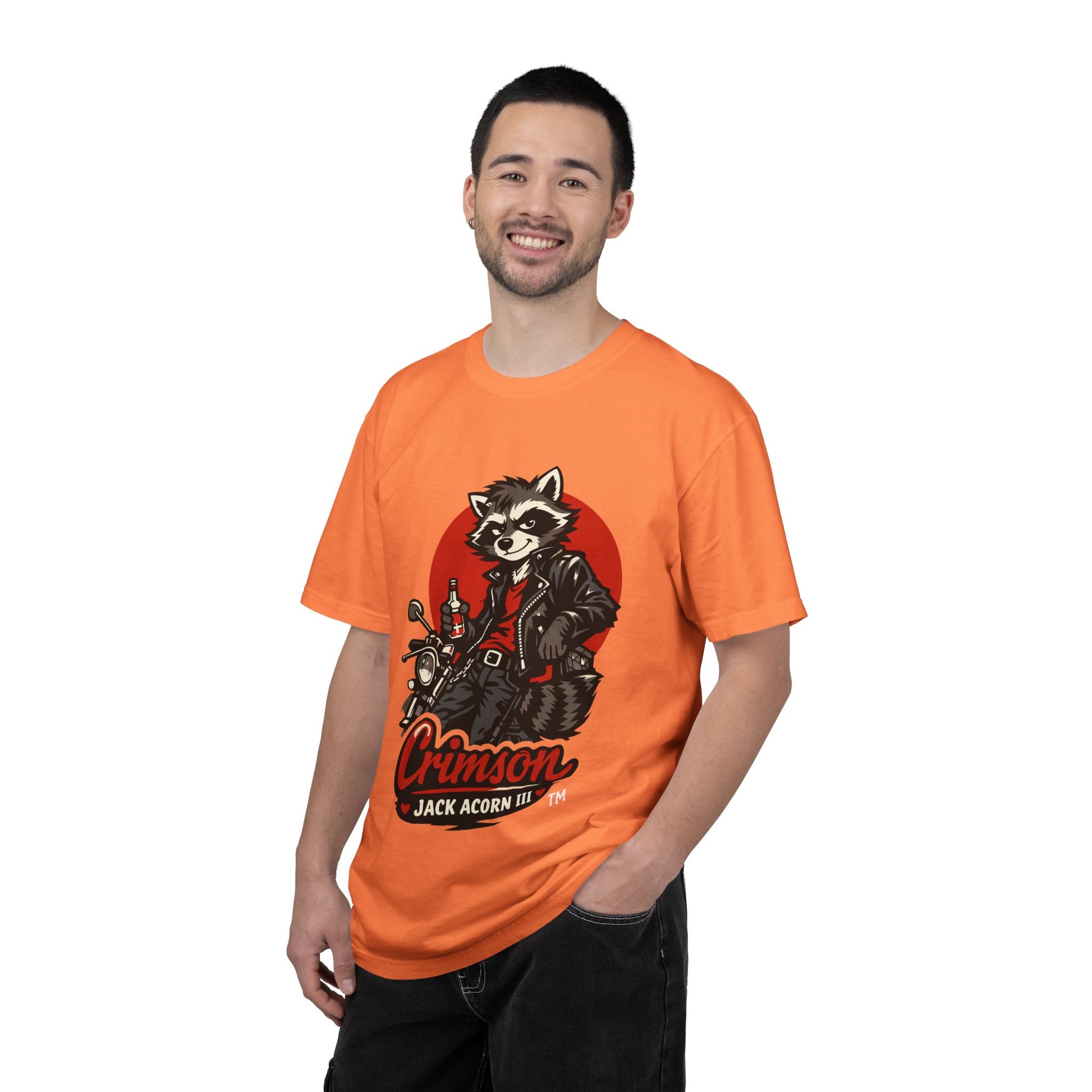 against a deep crimson sun—leather jacket, motorcycle, and a sly grin that speaks to late-night road trips and garage-band energy. The relaxed fit and substantial 6.1 oz fabric give it structure without stiffness; the garment-dyed finish adds a lived-in hue and supple hand that only improves with every wash. It sits naturally in streetwear or music-lover wardrobes, ready for open-road evenings, dive-bar shows, or casual weekends when you want an honest, characterful look.