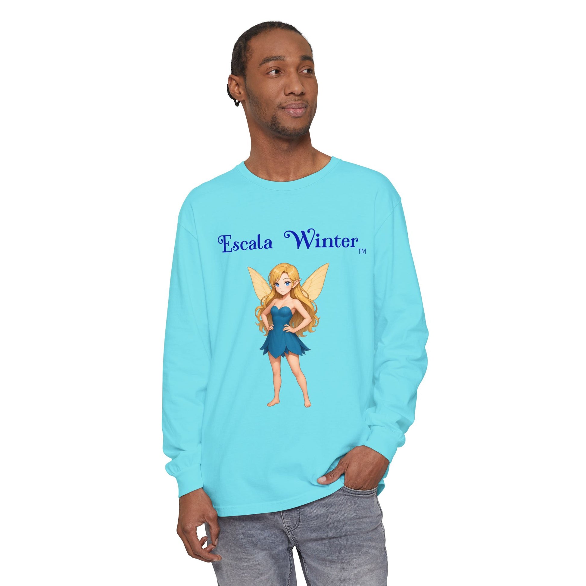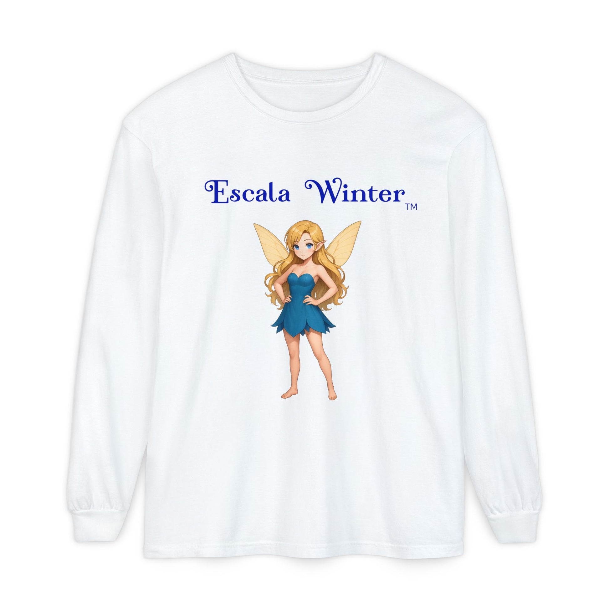 A soft, garment-dyed long sleeve that feels lived-in from the first wear. Lightweight but sturdy 100% ring-spun cotton drapes in a classic fit while ribbed-knit cuffs keep sleeves tidy as you move. The whimsical fairy illustration and delicate “Escala Winter” lettering lend a gentle, storybook charm — the sort of top you pull on for chilly mornings with coffee, slow walks through frosty streets, or quiet evenings curled up with a sketchbook. It’s relaxed and wearable, built to hold its color and shape thanks to neck-and-shoulder twill tape and double-stitched hems. Wear it with layered knits or alone when you want an uncomplicated piece that still feels personal and slightly magical.
