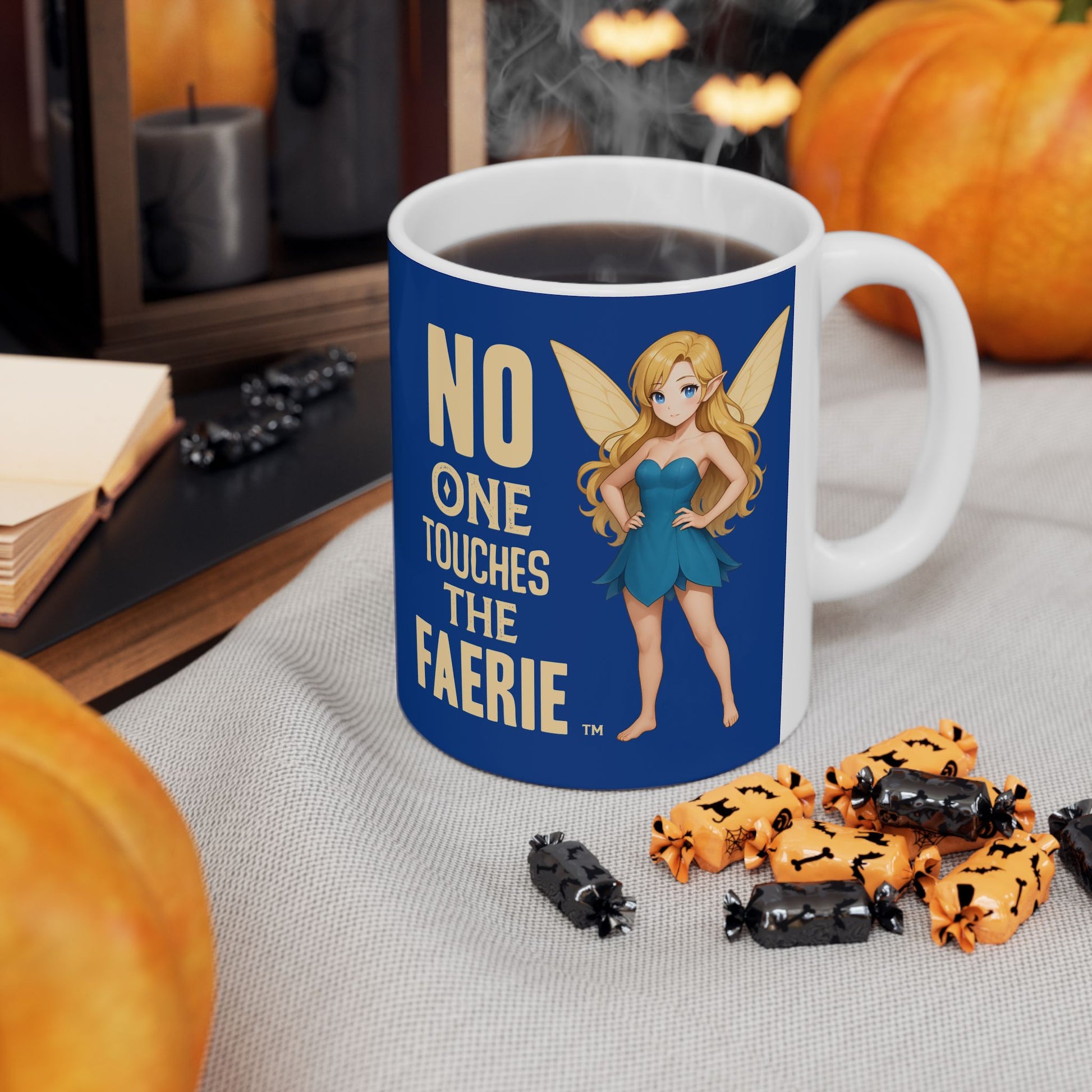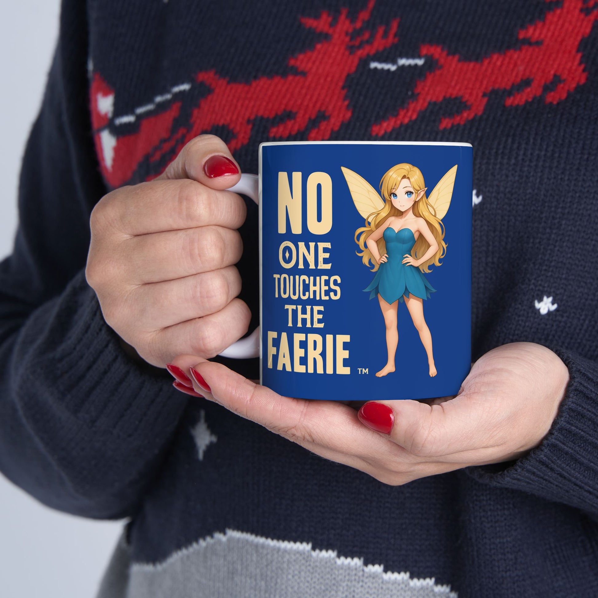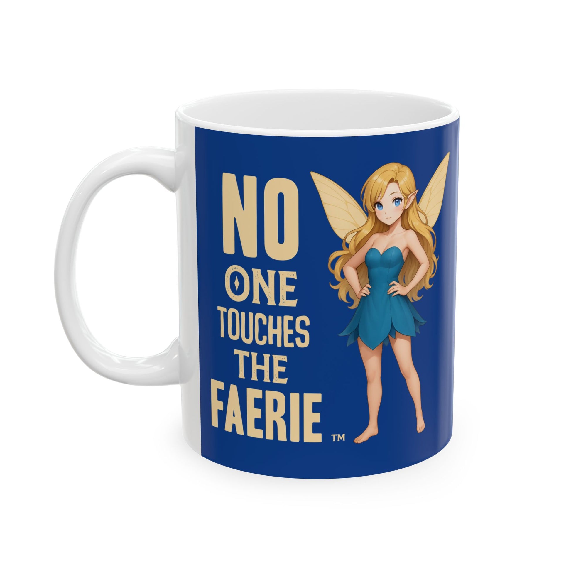 Bright, glossy ceramic mug featuring a bold blue background and a whimsical faerie illustration with the message “NO ONE TOUCHES THE FAERIE.” It brings a playful, protective energy to morning coffee or evening tea — like a tiny sentinel on your desk. The compact 11oz and larger 15oz options suit different sipping moods, while the comfortable C-handle and shiny finish make it pleasant to hold and display. Durable white ceramic ensures the vibrant print pops and stays vivid through everyday use. Lead- and BPA-free for confident, daily drinking.