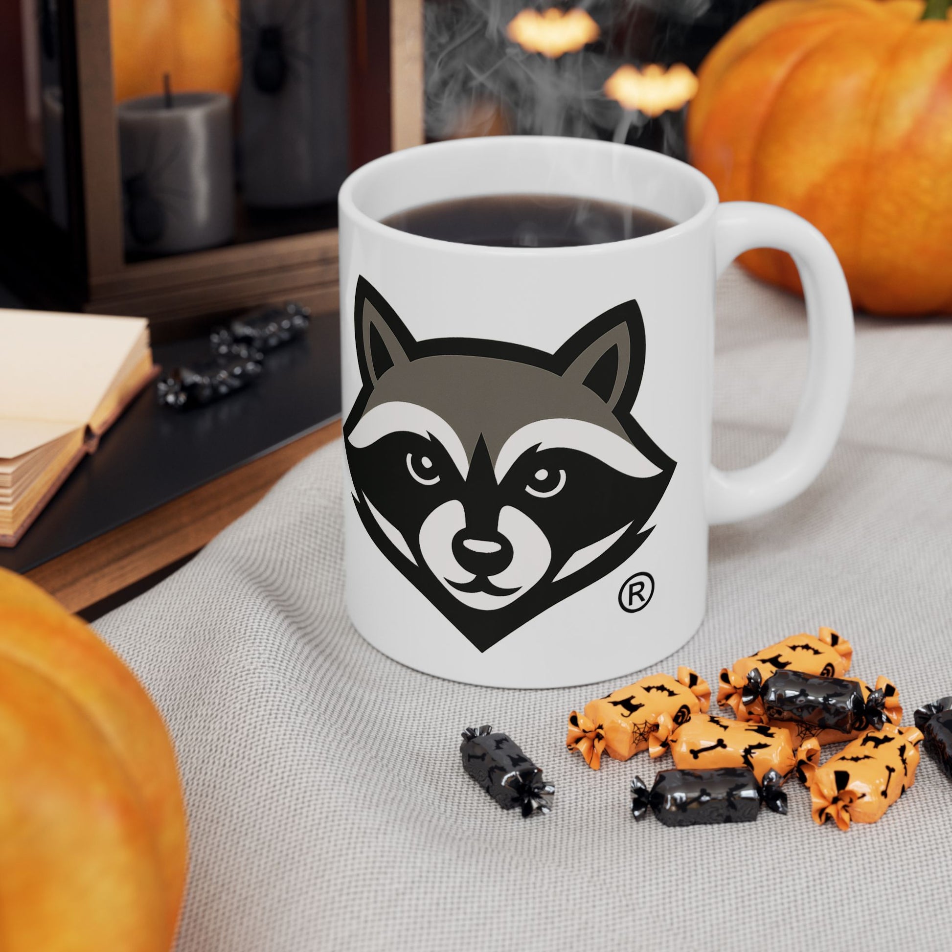 A sleek, glossy ceramic mug wrapped in deep black with a bold raccoon emblem that feels equal parts playful and sharp. The high-contrast print pops against the shiny surface, turning a simple morning coffee into a tiny ritual—quiet, clever, a little mischievous. It sits heavy enough to feel substantial in hand, the C-shaped handle giving a familiar, comfortable grip. Use it at your desk, beside a journal, or on a weekend porch with a wool blanket; the design reads like a wink to anyone who loves woodland motifs with modern edges. Safe for everyday use and built to keep its color and shine through microwaves and dishwashers, this mug blends personality with practical durability.